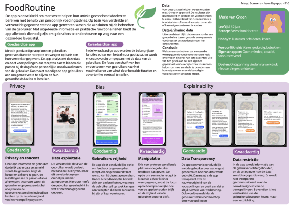 Met dit ontwerp nemen we een kritische kijk op hoe apps zijn opgebouwd en welke commerciële belangen erachter schuilgaan. Daarnaast leerden we in deze module na te denken over de impact en ethiek van Artificial Intelligence (AI), zodat we bewustere keuzes kunnen maken bij het inzetten van AI in onze ontwerpen. Ook deden we ervaringen op met ethiek-, data- en UX-tools om deze aspecten op een verantwoorde manier te integreren.