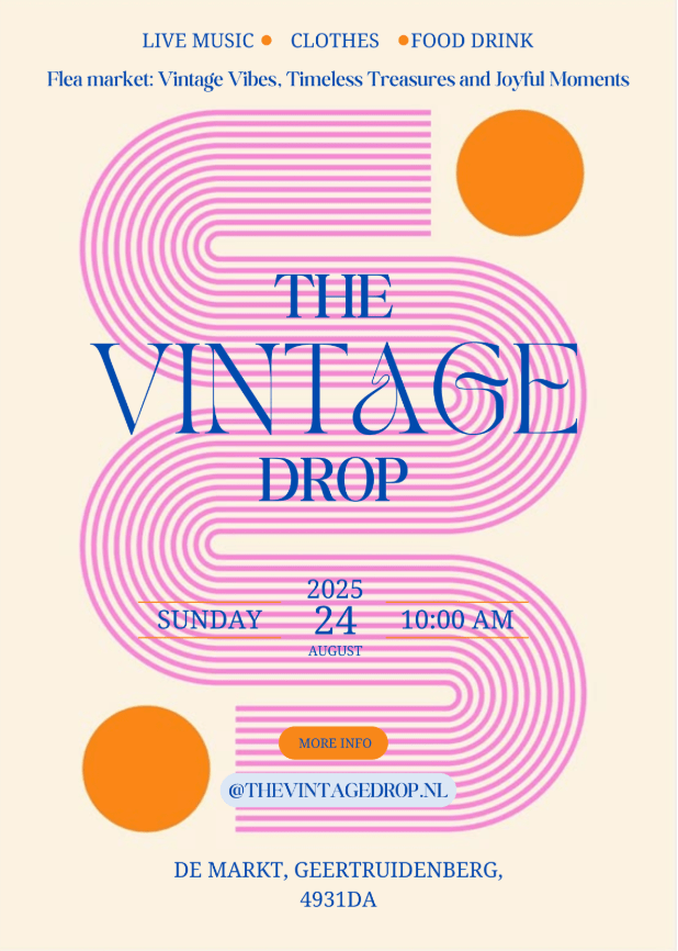 The Vintage Drop is een conceptuele vlooienmarkt die retro-liefhebbers, schatzoekers en iedereen met een passie voor vintage samenbrengt. Georganiseerd in Geertruidenberg, richt dit evenement zich op het aantrekken van een jongere generatie, terwijl het de nostalgische charme van het verleden behoudt. Het is een bruisend evenement waar old-school stijlen samenkomen met een moderne vibe, waardoor een unieke mix van toen en nu ontstaat.